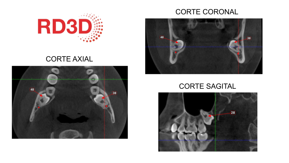 *En la imagen realizada en RD3D observamos los diferentes planos o cortes de un CBCT en el que se señalan las muelas del juicio con su respectivo número de pieza.