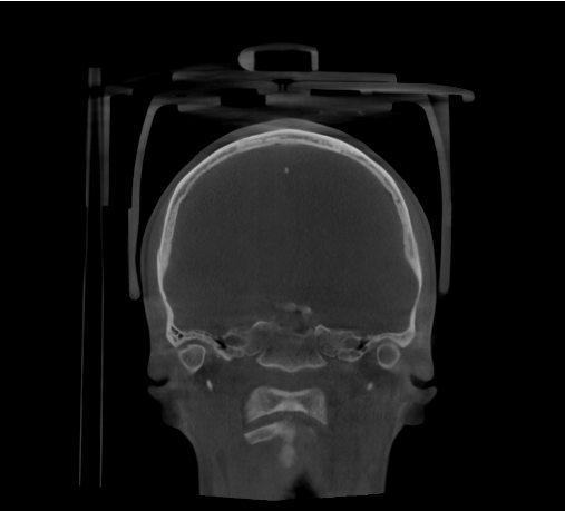 Imagen 1: Vista coronal de CBCT de cráneo completo para cirugía ortognática (FOV 23×26). Imagen aportada por RD3D.