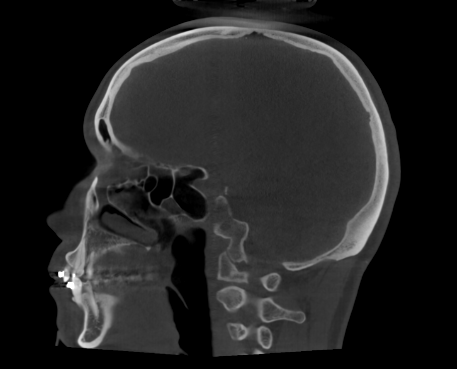 Imagen 2: Vista sagital de CBCT de cráneo completo para cirugía ortognática (FOV 23×26). Imagen aportada por RD3D.