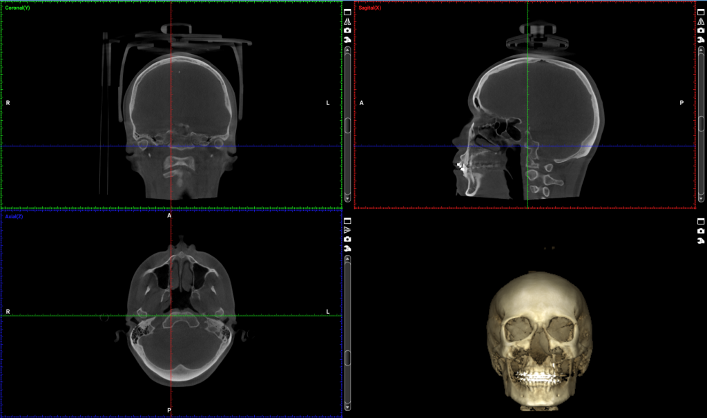 Imagen 1: Vista coronal de CBCT de cráneo completo para cirugía ortognática (FOV 23×26). Imagen aportada por RD3D.